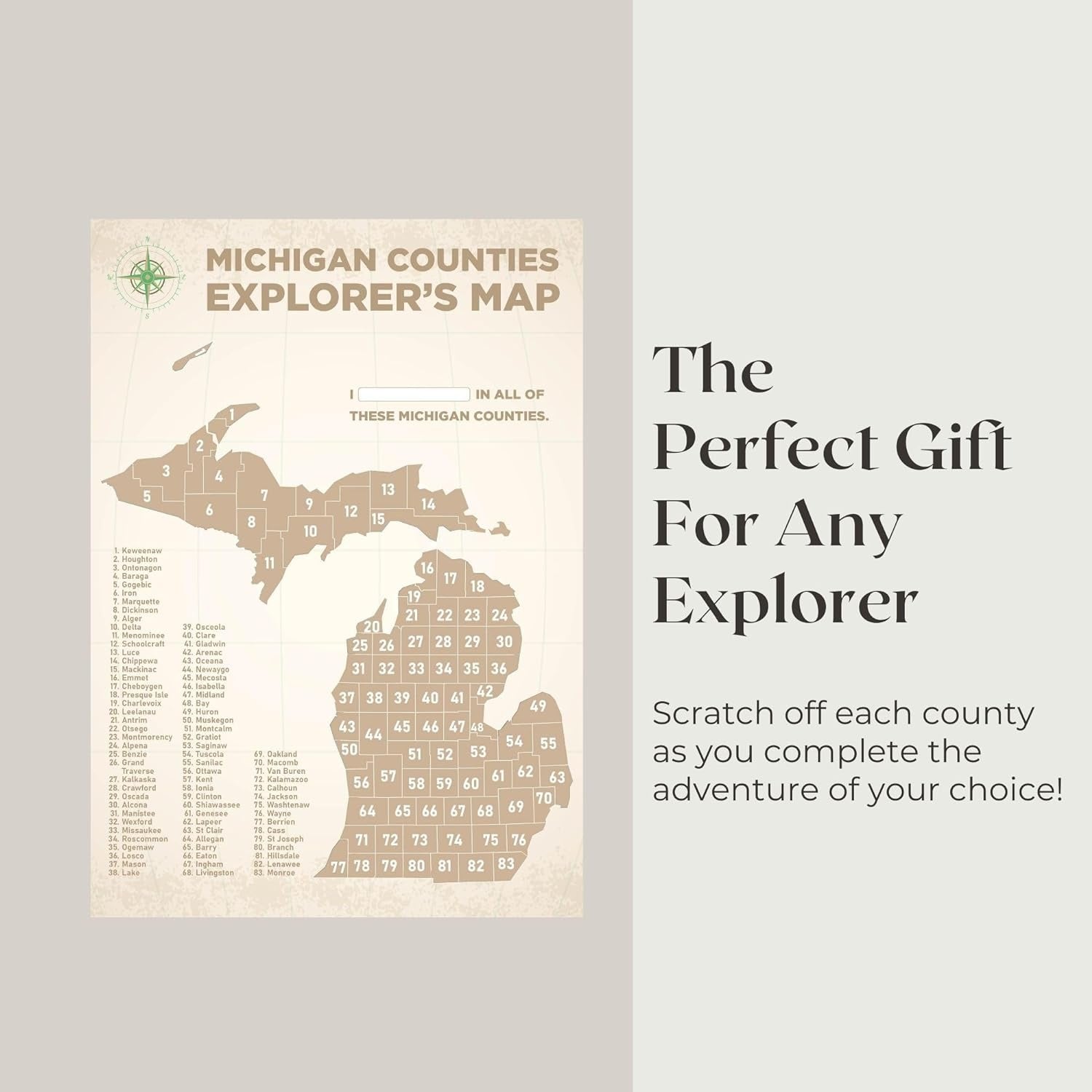 Embark on a personalized journey of exploration with our Michigan County Scratch Off Poster – a unique and captivating addition to your living space. This poster features the intricate outline of Michigan, divided into 83 counties, each concealed beneath scratch-off foil. Hang it in your living room, dining room, or den, and transform your wall into a vibrant tapestry.