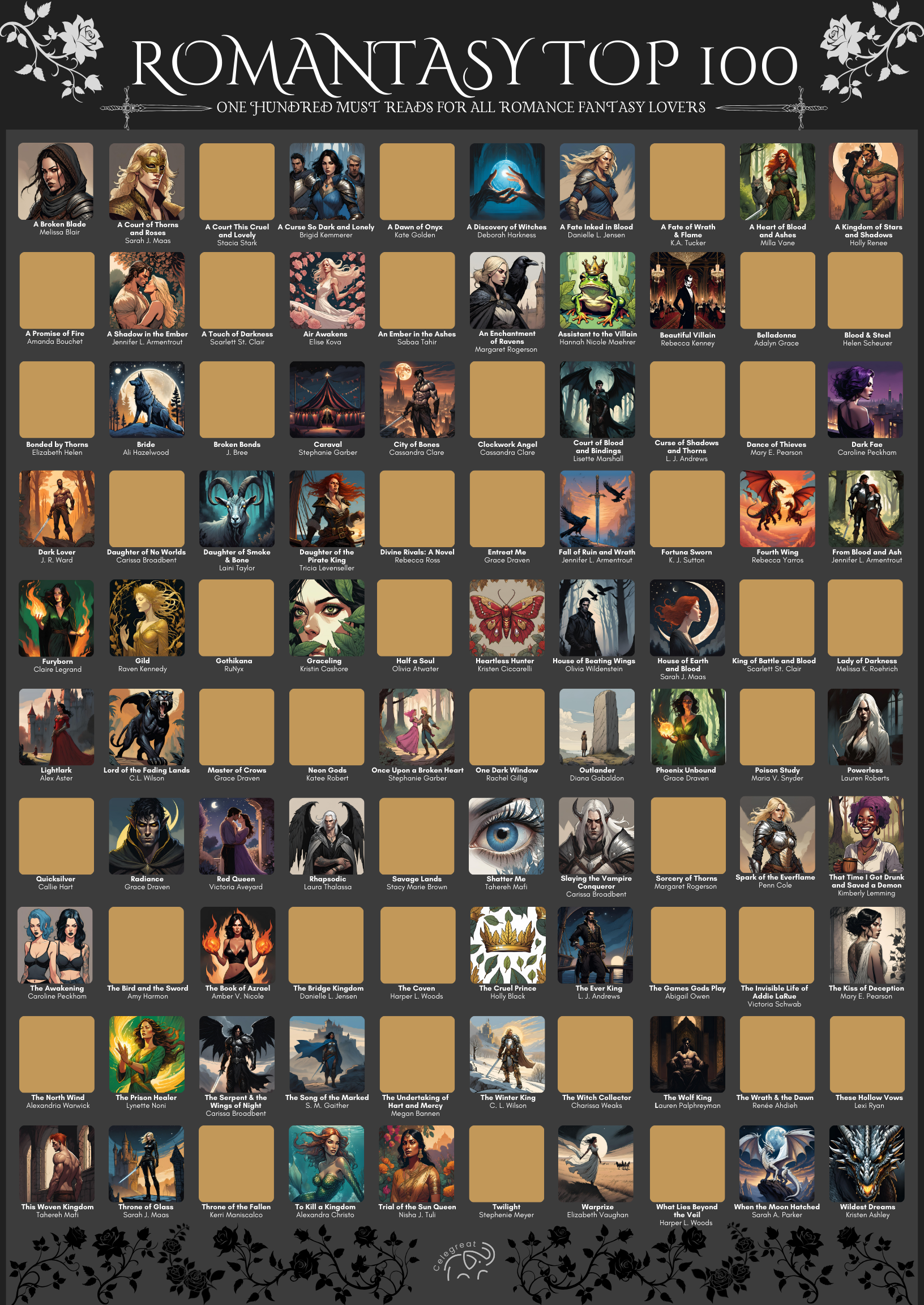This stunning 10x10 grid poster showcases the crème de la crème of romantasy literature, featuring 100 must-read titles that will set your heart aflutter and transport you to magical realms. Each square on this beautifully designed poster includes:
