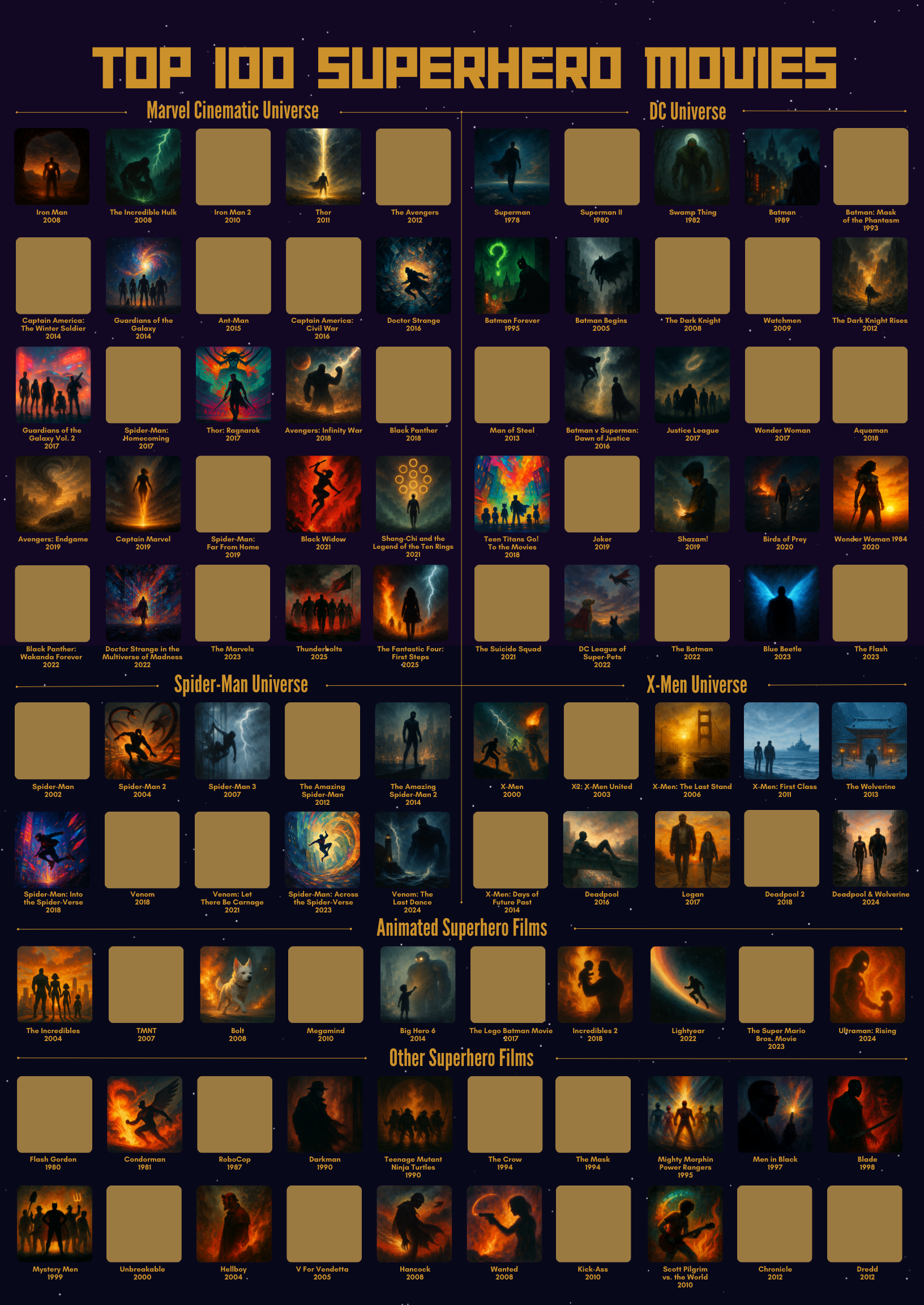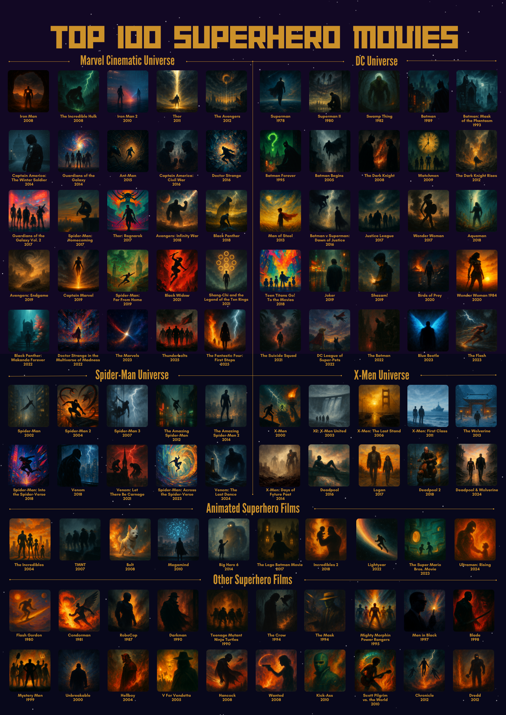 Perfectly Organized Layout: Our 10x10 grid is thoughtfully arranged into six distinct superhero universes, with films organized chronologically within each category: